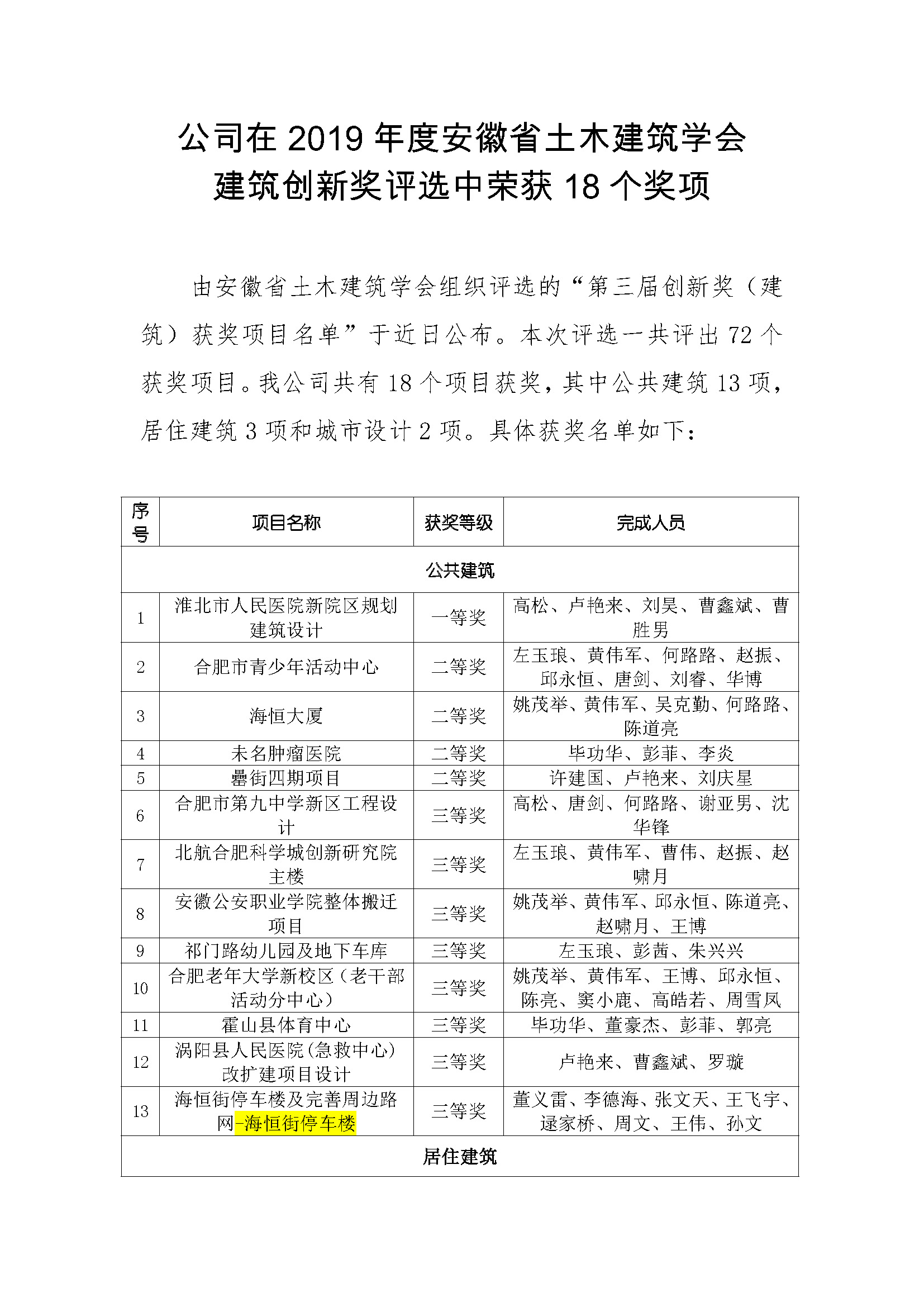 公司在2019年度安徽省土木建筑學(xué)會建筑創(chuàng)新獎評選中榮獲18個獎項